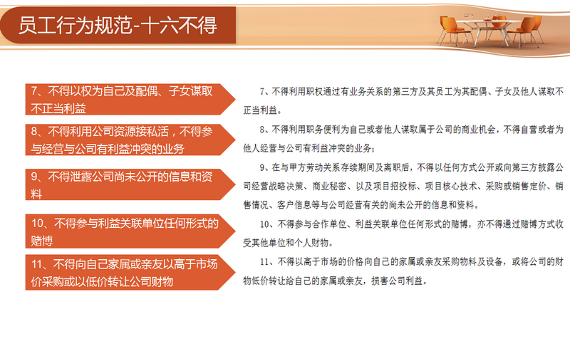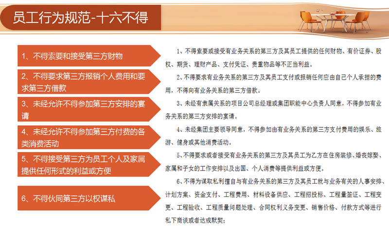 宣講環(huán)節(jié)主要從四個(gè)方面著手:分別為“目的、行為規(guī)范約定、違約責(zé)任與管理和連帶責(zé)任”。員工需要從十六方面規(guī)范自身的行為,包括不得索要和接受第三方財(cái)物、不得要求第三方報(bào)銷(xiāo)個(gè)人費(fèi)用和要求第三方借款、未經(jīng)允許不得參加第三方安排的宴請(qǐng)等等。